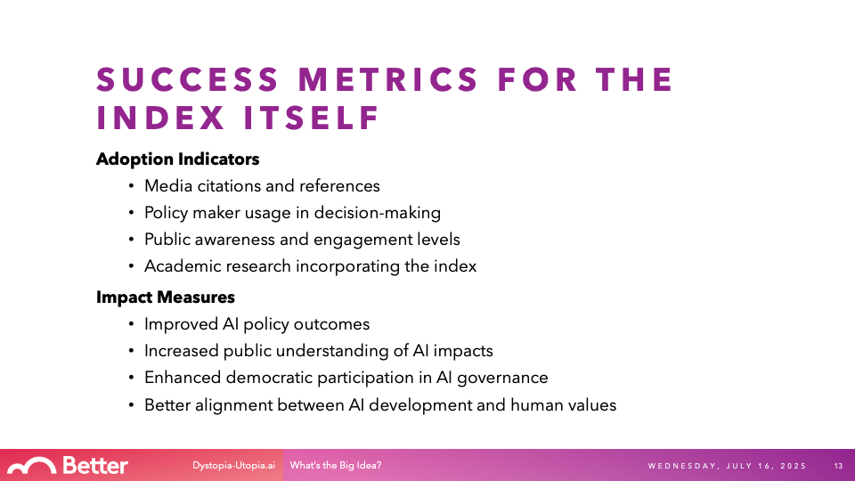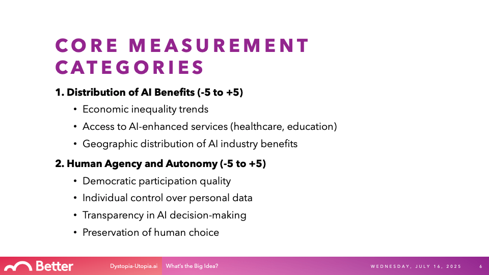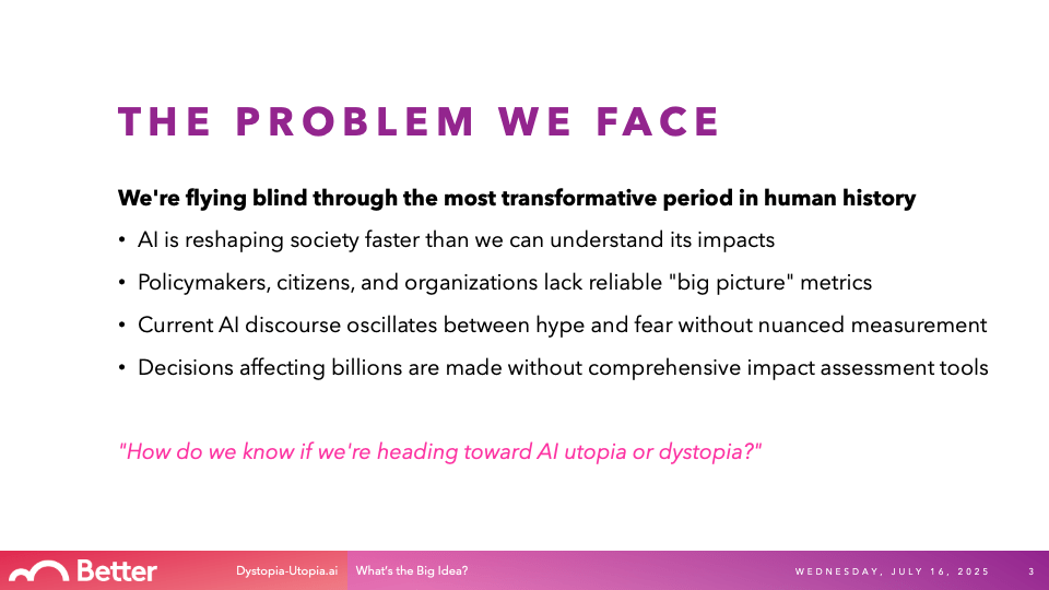 I’m back after a short vacation in the real world (Montana, Yellowstone, Beartooth National Forest). While I was gone I didn’t blog but I did do quite a bit of thinking about the seismic impact AI’s emergence is having on society, and feel that we are “rushing into a darkened room, filled with swirling blades, landmines, and meat-grinders, or as my Mom would say, “running with scissors.” We, and more importantly the people we’ve elected to steer our ship of state, need a simple, intuitive tool to track AI’s status, developments, and trends, and how widely it’s benefits are shared beyond Silicon Valley and Wall Street – it’s impact on the livelihood, happiness and well-being of Humanity. Further, we need a mechanism for gaming out the impact of AI development plans, product launches, and AI legislative and regulatory decisions for the human species.